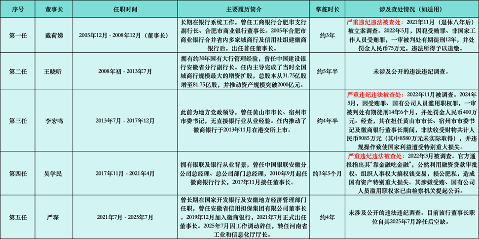 第四任董事长吴学民则在调离徽商银行后迅速被查,其问题被指与“靠金融吃金融”、进行利益输送有关。